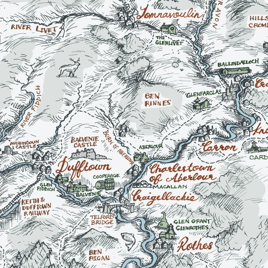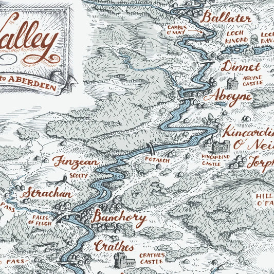 Rho Rho Illustrations is a company run by Thomas and Bridget Rhodes, who create a variety of bespoke illustrations and graphic designs. They work from their home in Aberdeenshire, Scotland to create many beautiful pieces of wall art influenced by their backgrounds in engineering and industrial design, and showing off their incredible technical abilities. We stock a sample of their incredible valley maps with a focus on Dee and Speyside.