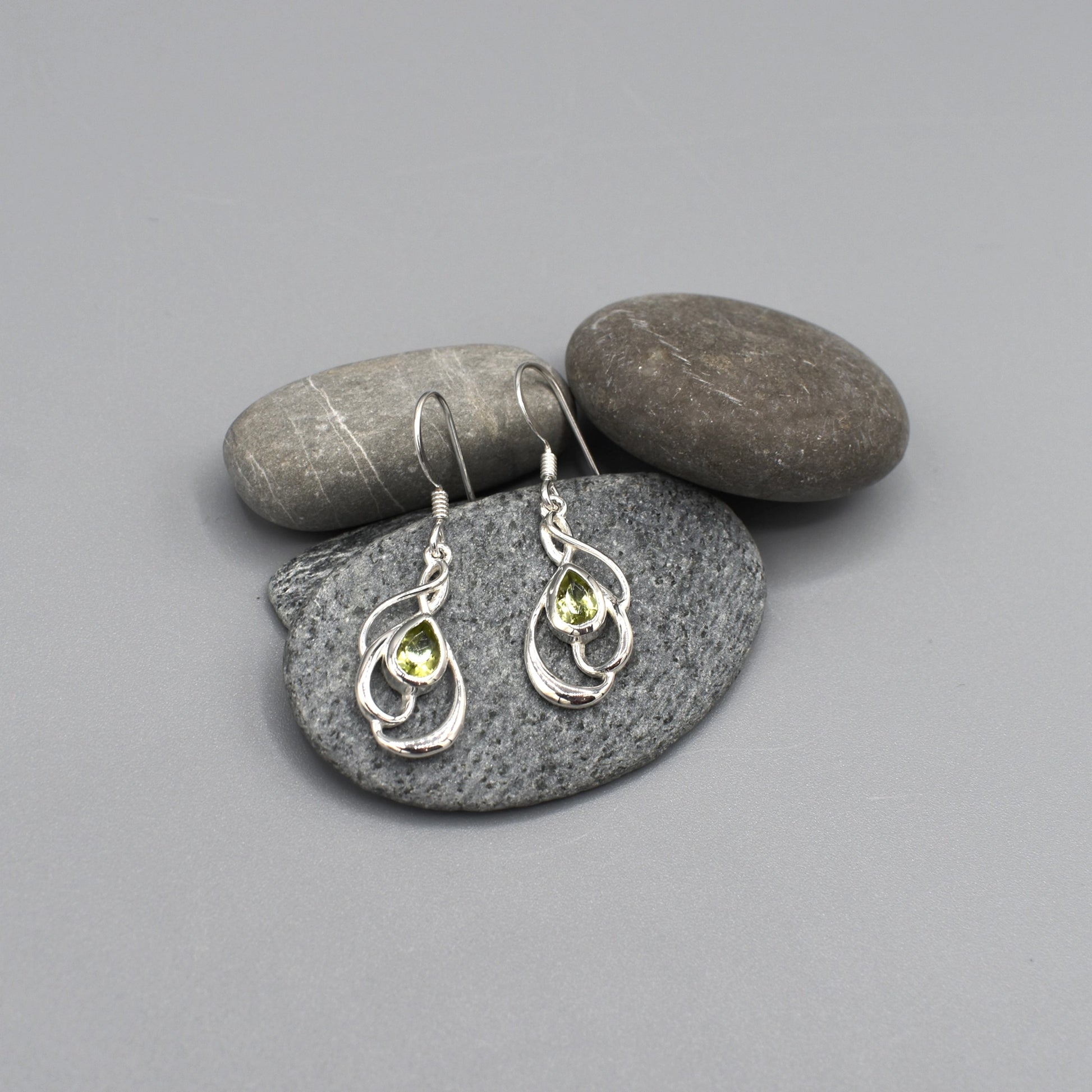 A pair of sterling silver drop earrings featuring an abstract swirling weave design with faceted teardrop peridot stones. Matching pendant is also available.