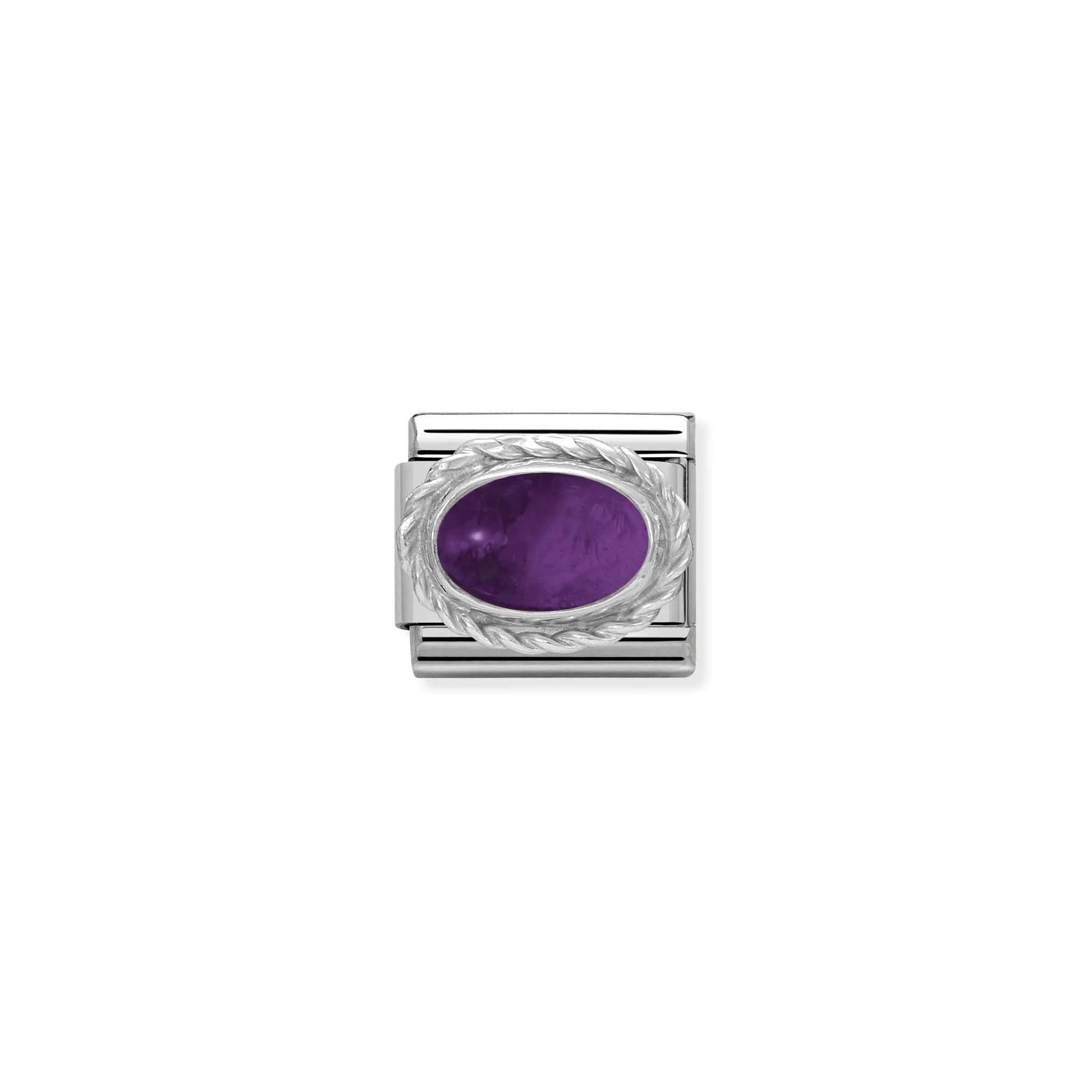 This stainless steel charm is set with an amethyst oval stone, surrounded by silver. This charm fits the classic Nomination bracelet.