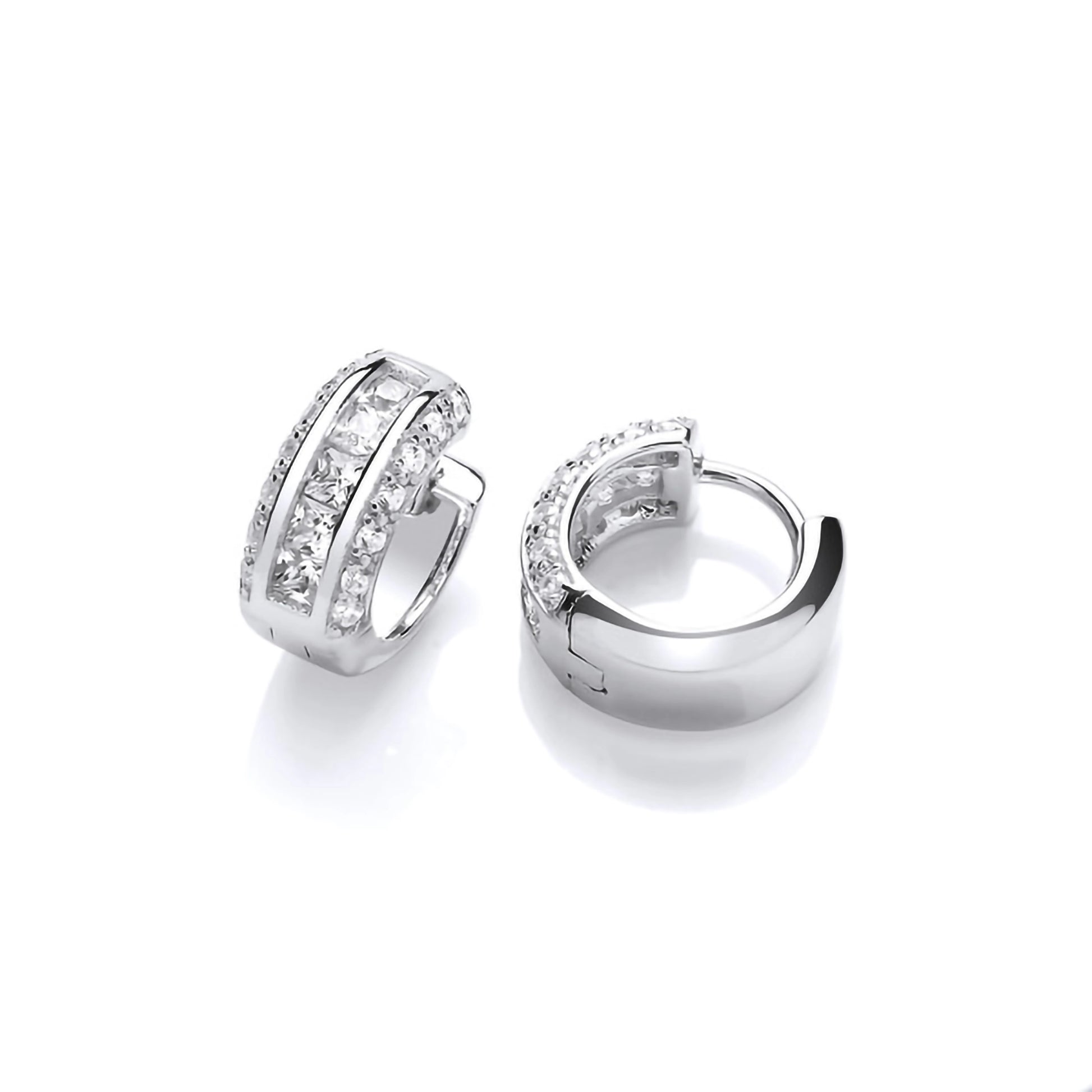 These sterling silver huggie hoop earrings feature three rows of cubic zirconia, with a centre row of larger square cut stones, and are finished with a highly polished finish. A huggie hoop sits close to the ear when worn for an elegant option that doesn't move around.