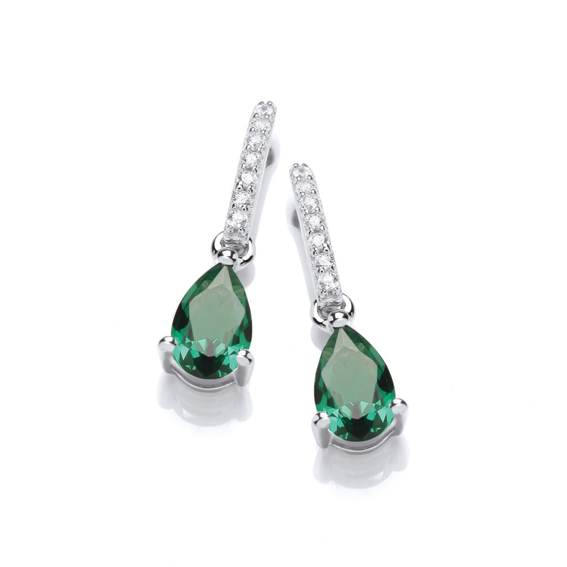 These silver drop earrings feature simple faceted teardrop emerald coloured cubic zirconia stones for an elegant, vintage sparkle, with small round white stones on the bails. Matching pendant is also available.