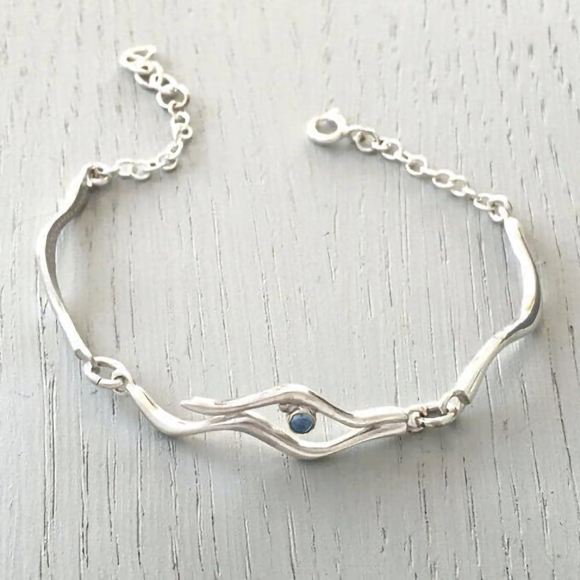 Part of the 'Ebbing Sands' collection by acclaimed Scottish jewellery designer, Celina Rupp, this bracelet features beautifully delicate and detailed handcrafted silverwork with two ripples containing a round blue topaz stone. This design represents the magical ripples left behind in the sand by the ebbing tide, and the blue topaz stone beautifully depicts the hues of the water.