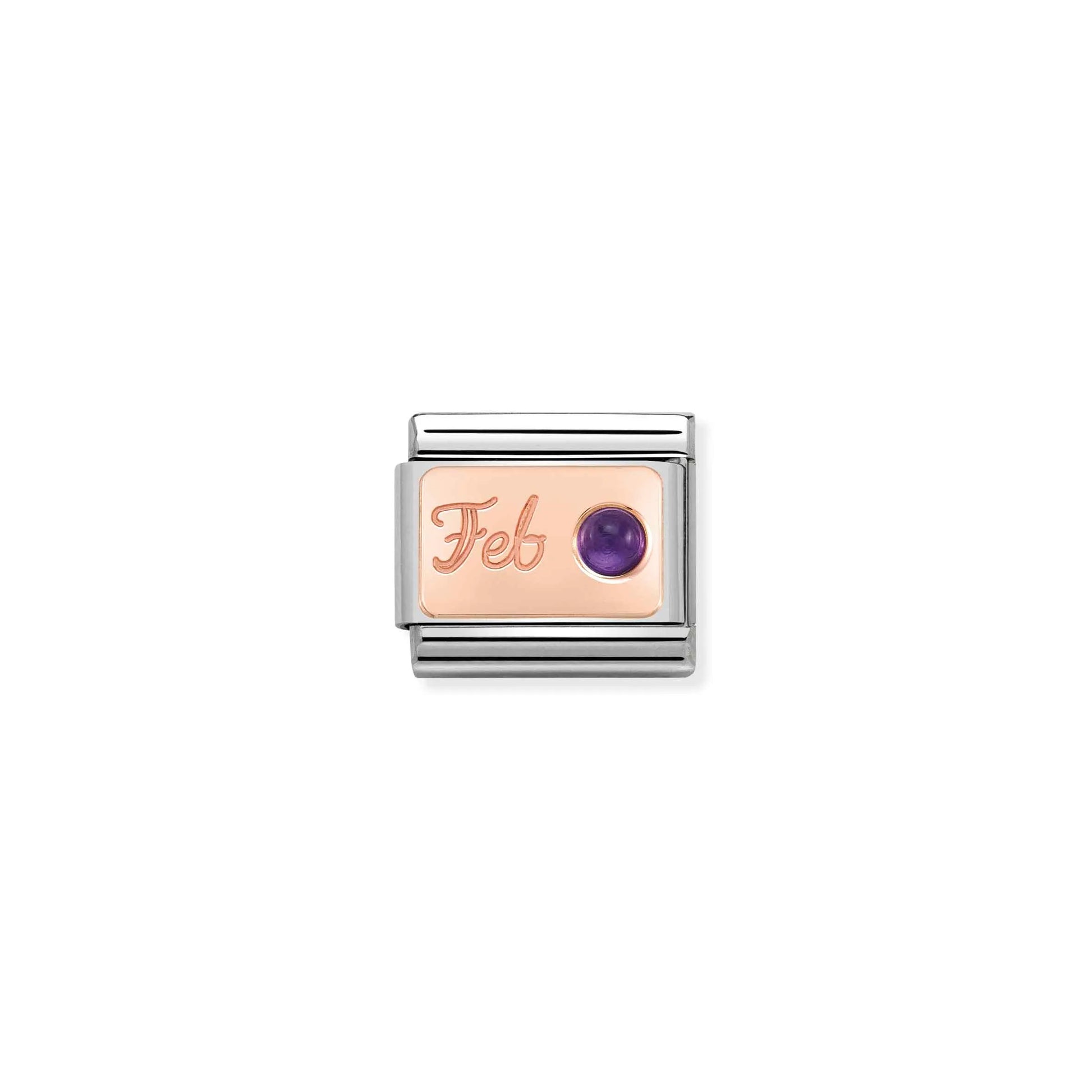 This stainless steel charm features February's birthstone - amethyst, set in 9k rose gold. This charm fits the classic Nomination bracelet.