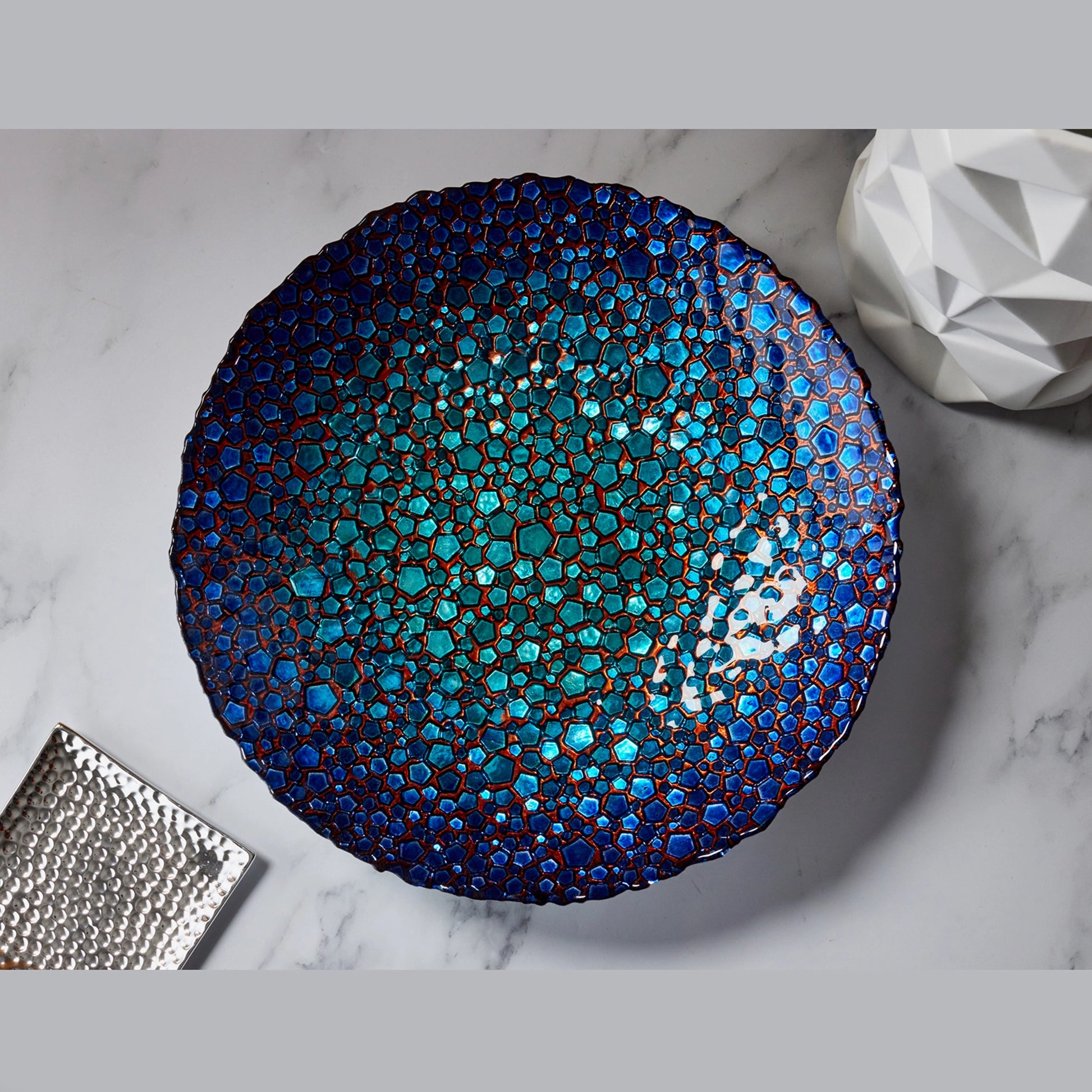 This decorative bowl has been hand decorated and textured with a unique abstract design that features colours like peacock feathers and shapes like coral in blue, green and rust orange. It would be a stunning decorative piece or wall ornament, making it an ideal gift for a special occasion, and sure to be a conversation starter.