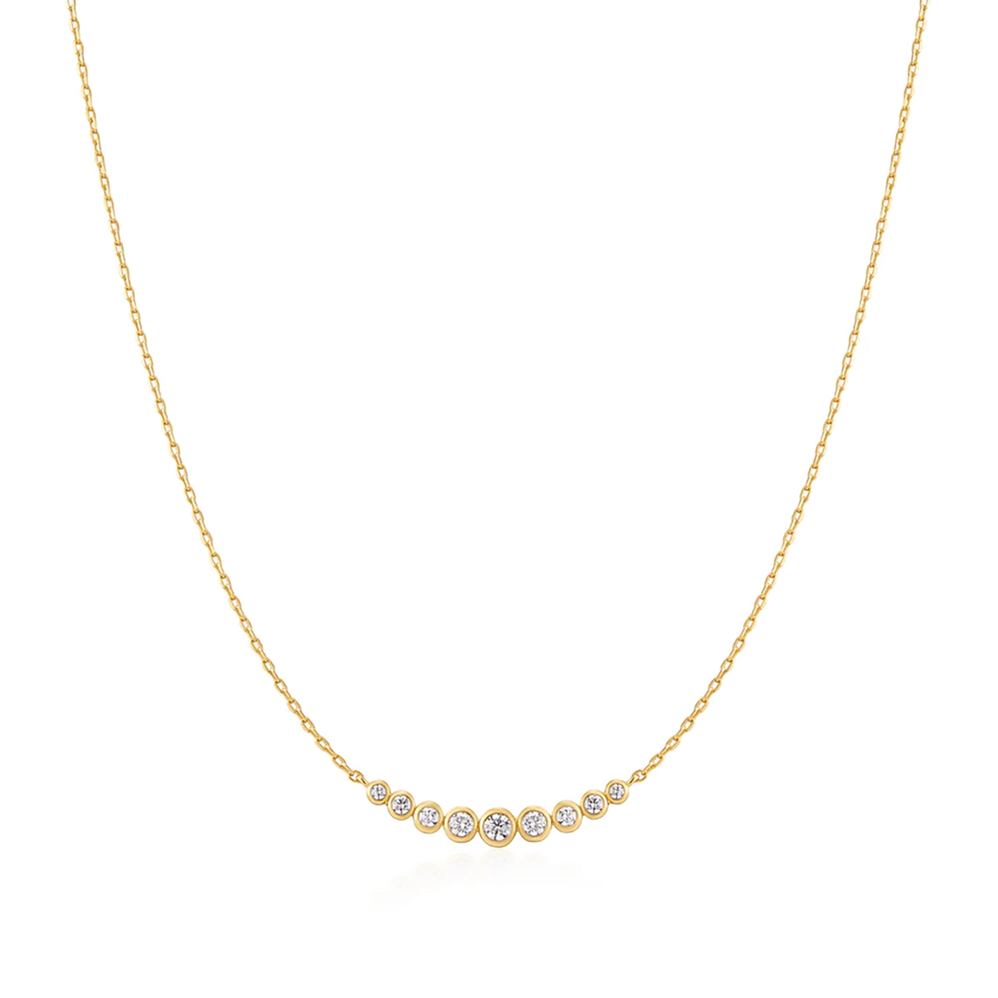 This elegant necklace features a delicate chain adorned with a simple arc of bezel-set cubic zirconia stones that graduate in size from the centre.
