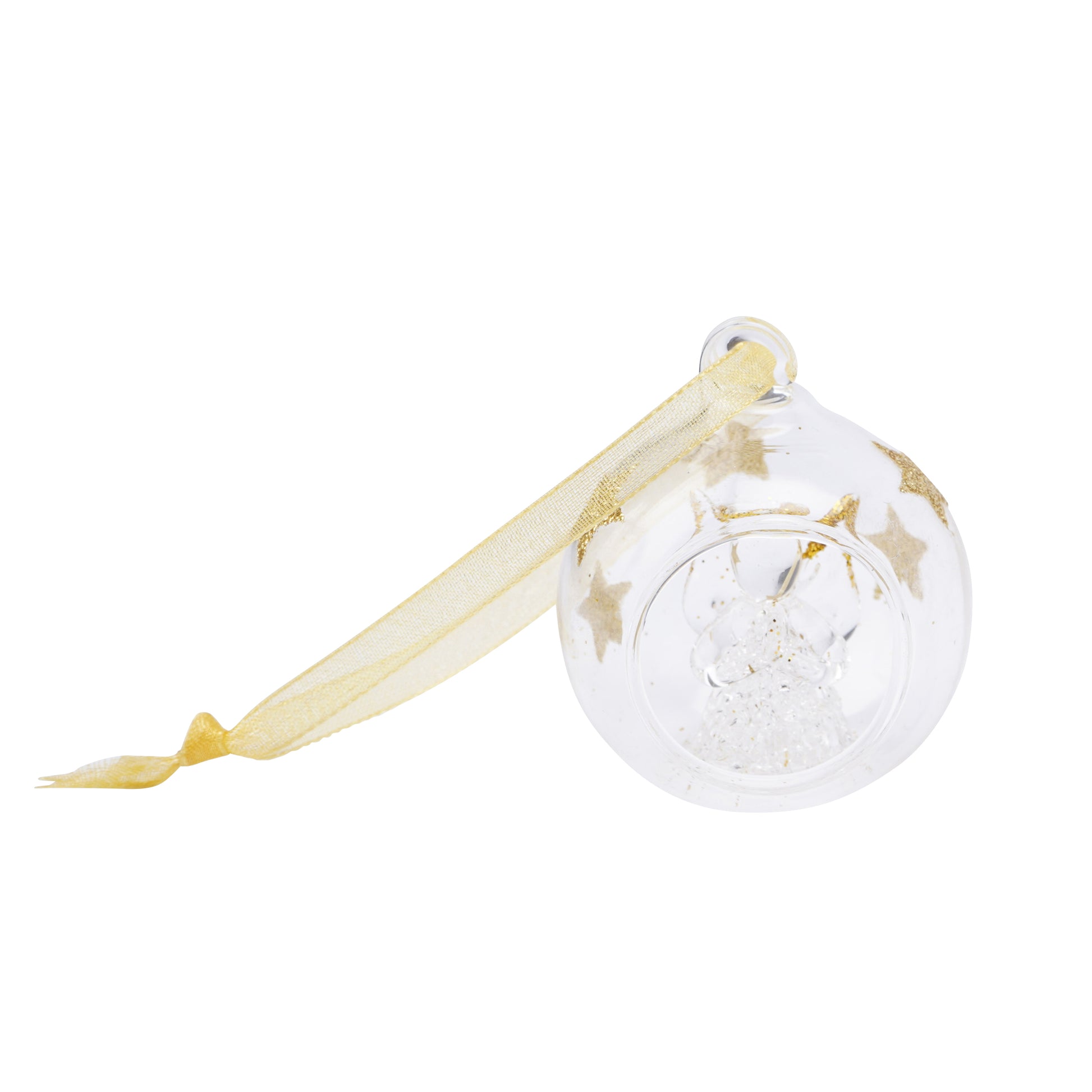 Welcome the festive season with this adorable little hanging bauble with a glass angel inside and gold glitter stars. It features a gold ribbon tie so it can hang on the Christmas tree.
