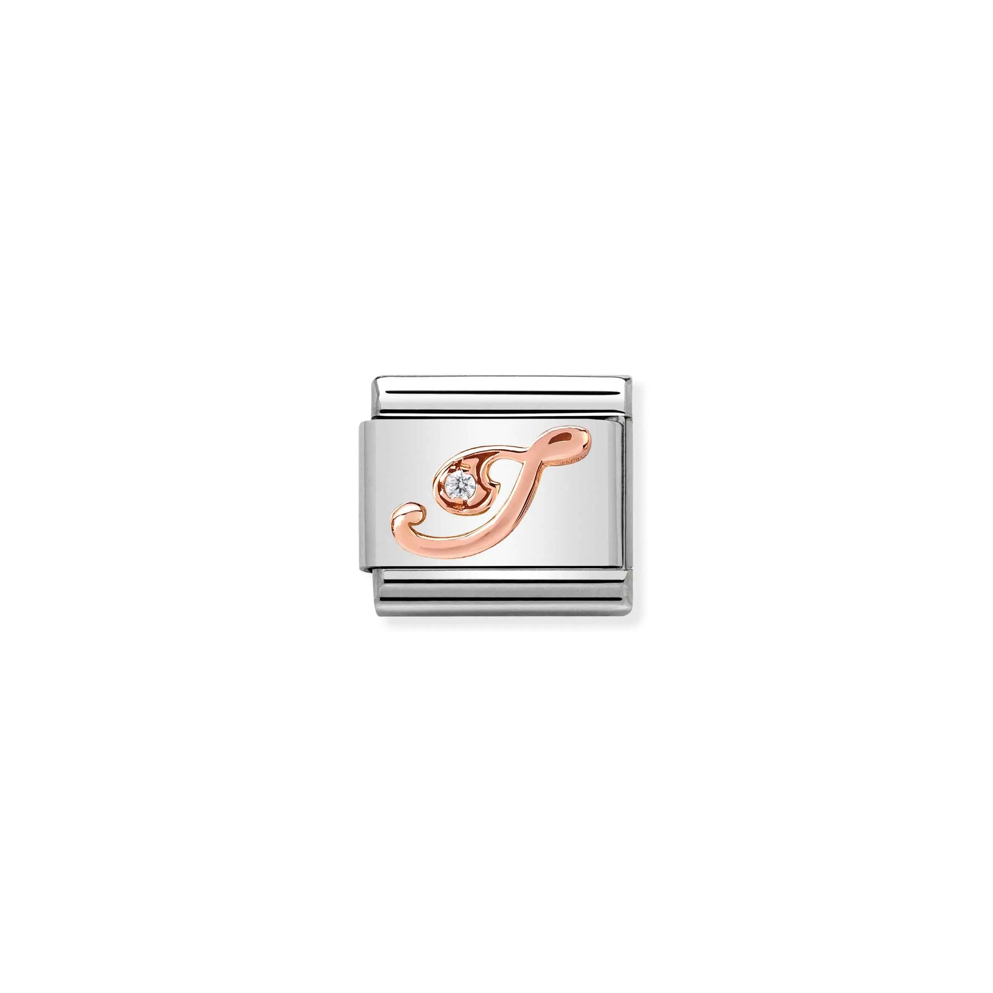 This stainless steel charm is set with a 9K rose gold letter 'I' with a cubic zirconia. This charm fits the classic Nomination bracelet.