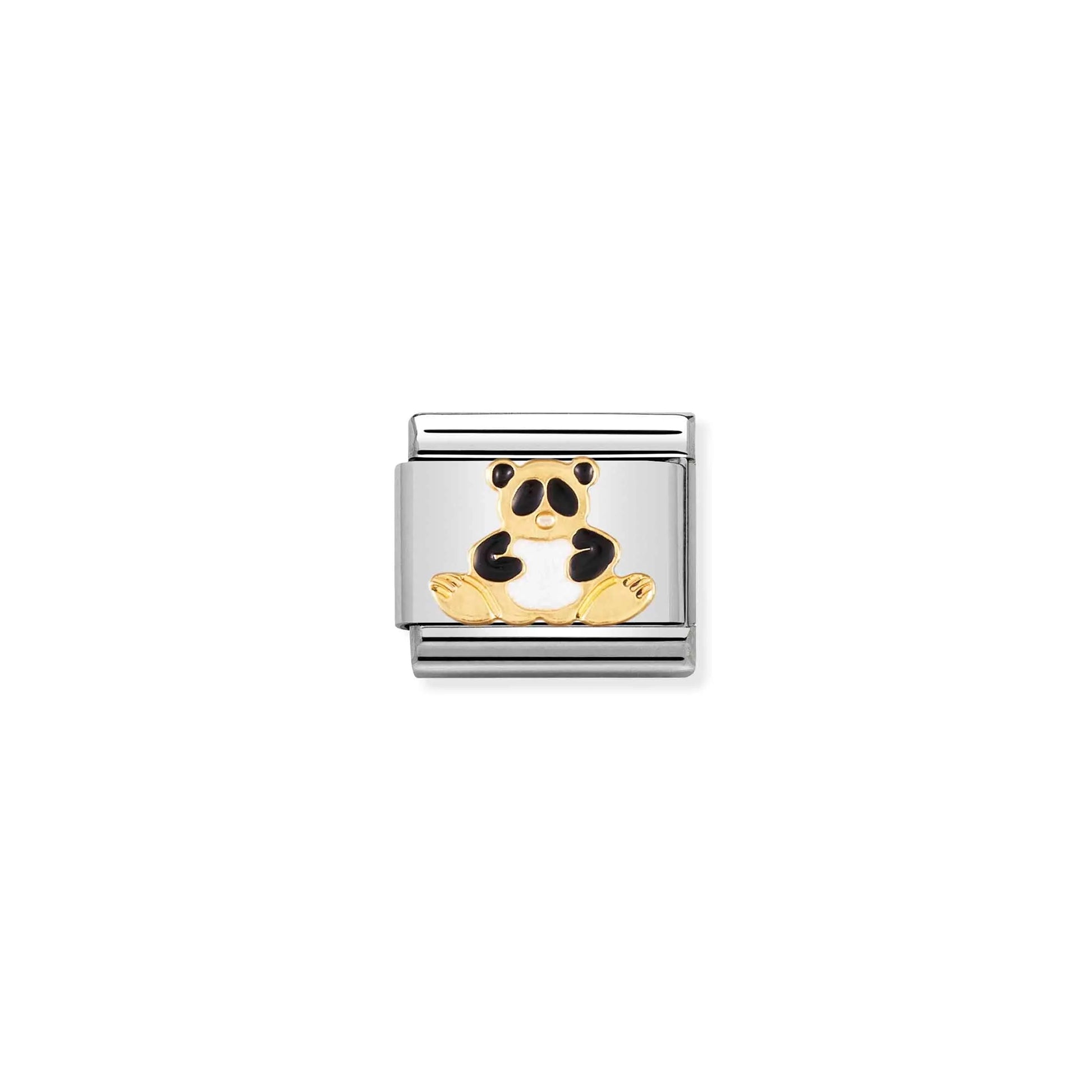This stainless steel charm is set with an 18K gold and enamel panda. This charm fits the classic Nomination bracelet. Each charm comes in official Nomination packaging.