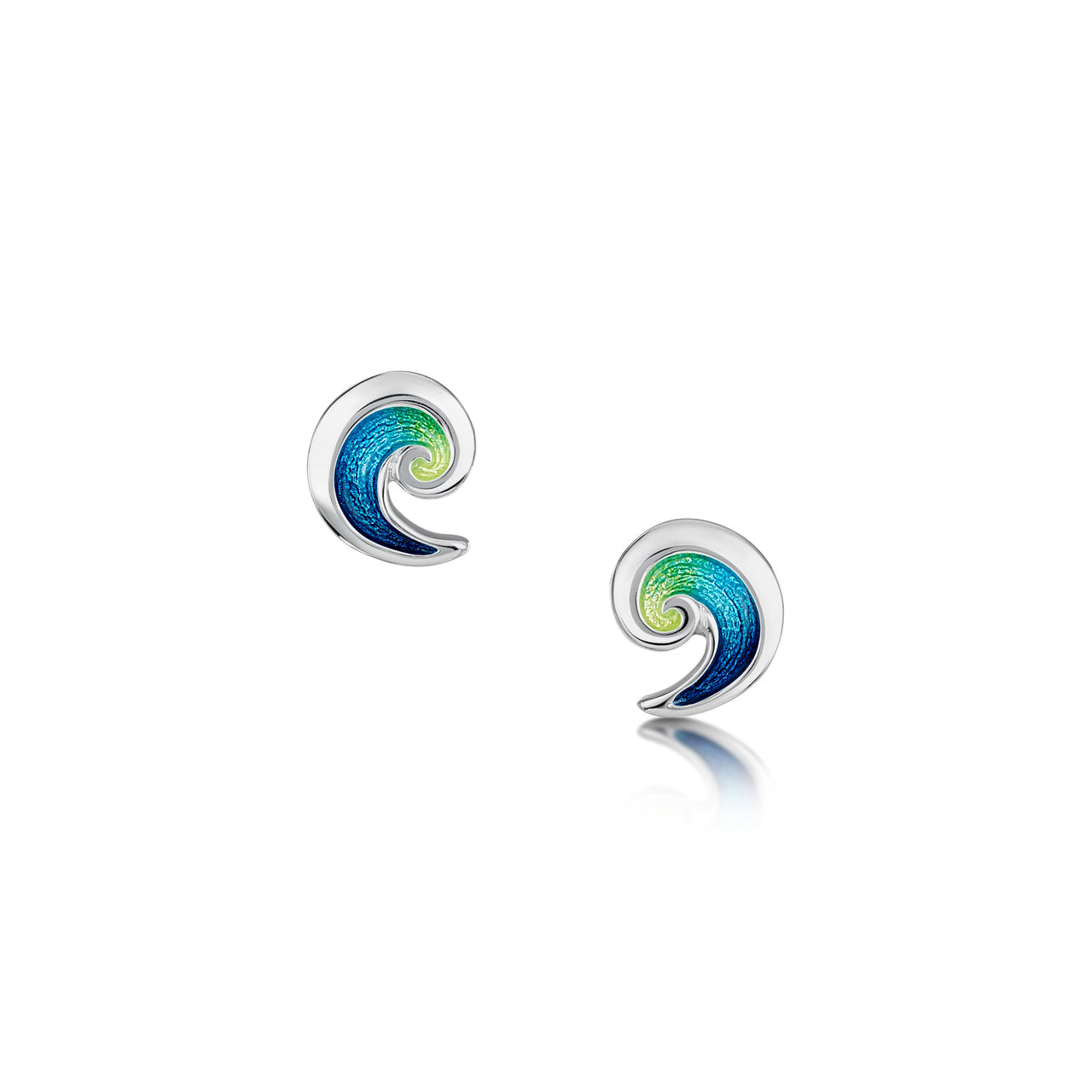 Part of the 'Pentland' collection by renowned Scottish jewellery designer, Sheila Fleet, these stud earrings feature stunning detail with rich blue green enamelling and intricate silver work, all beautifully handmade. This popular design was inspired by the Pentland Firth, the rugged sea that separates Orkney from Caithness in the Northeast of Scotland. It has some of the strongest tides in the world, and this collection captures the incredible movement of the waves, the deep and moody colours, and the drama of this tumultuous body of water.