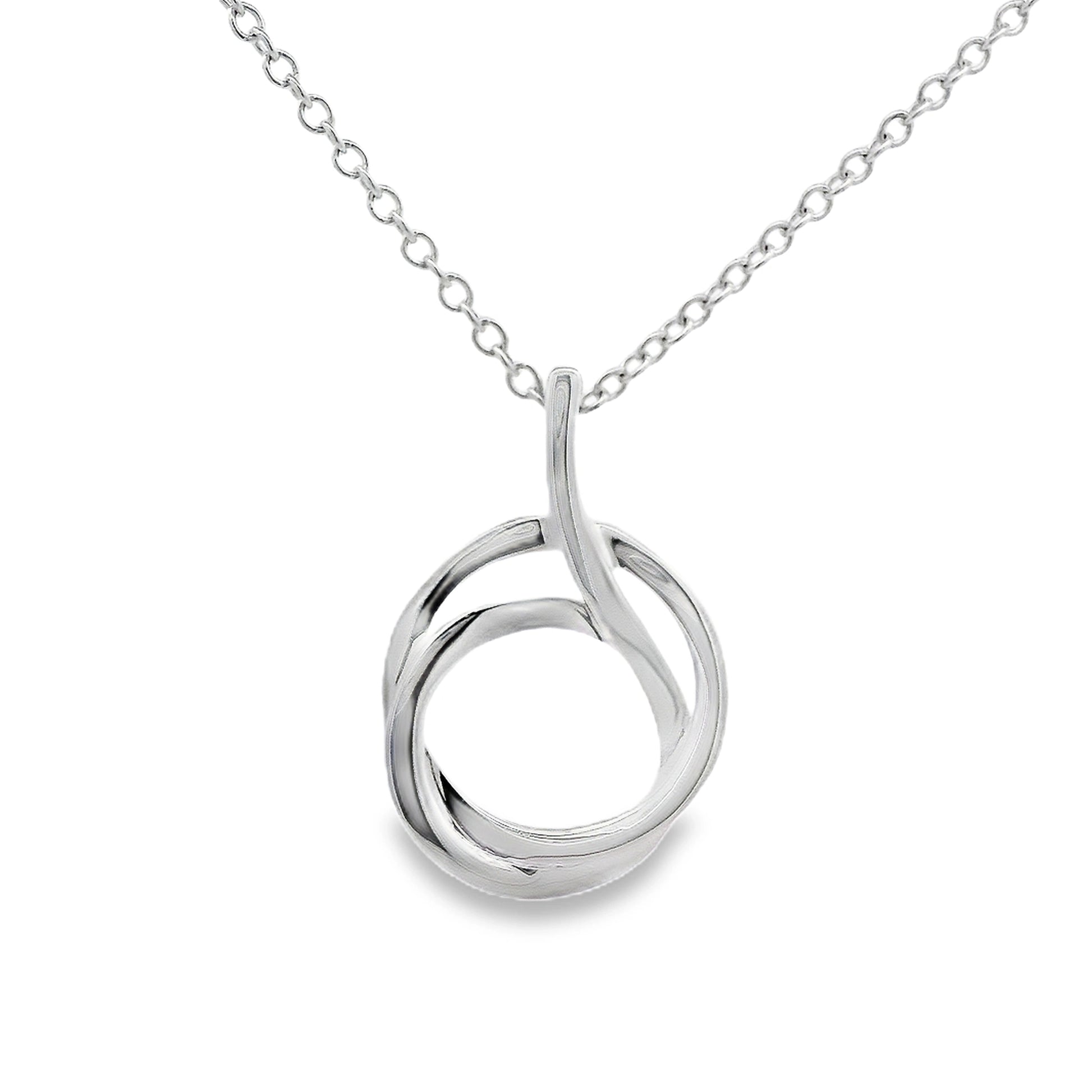 This modern silver necklace features a pendant shaped with a twisted knotted circle design. It comes with a highly polished finish and is supplied on an adjustable 16-18" silver chain.