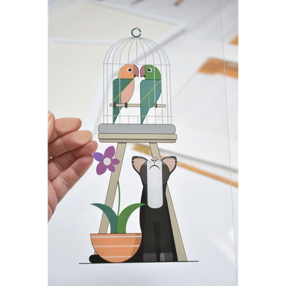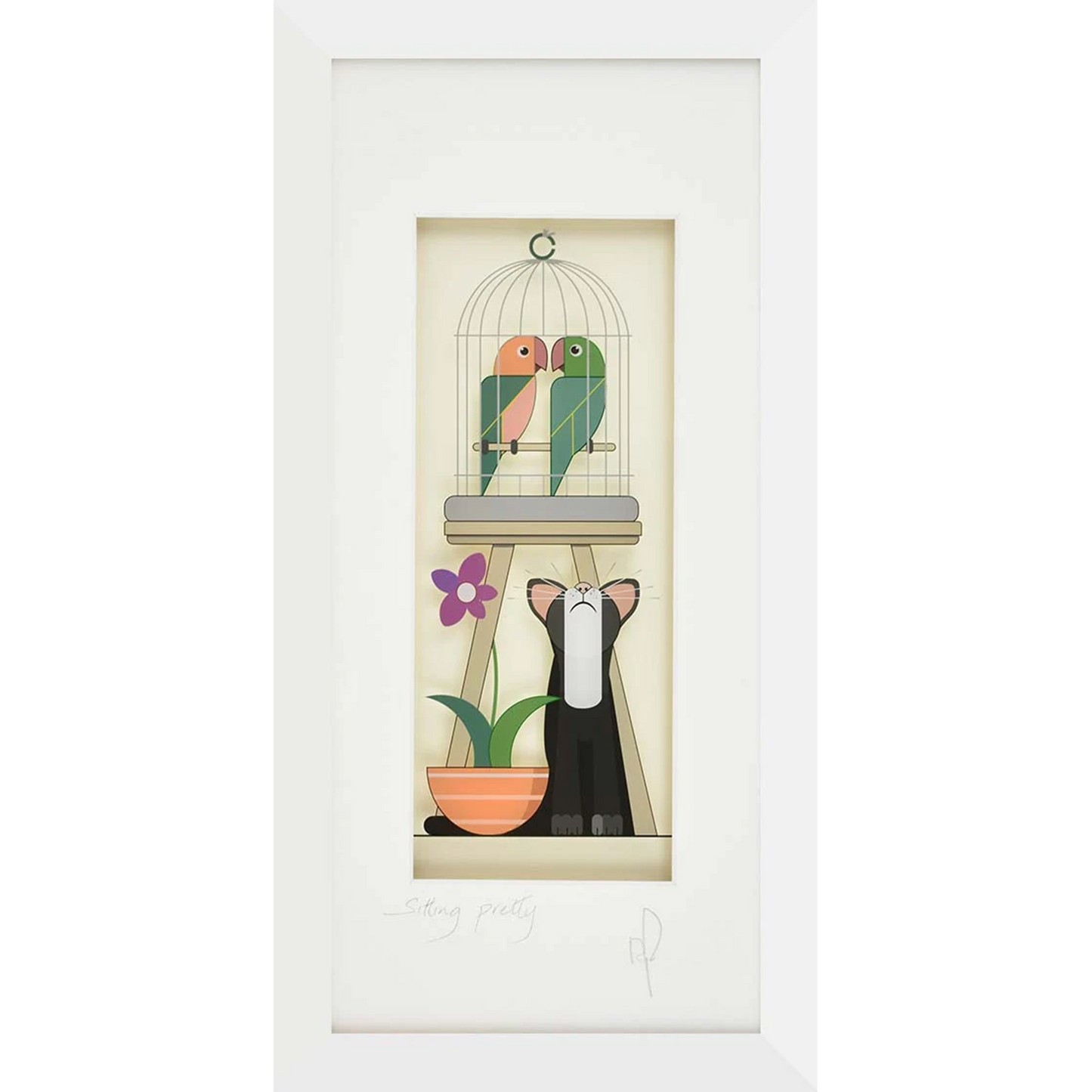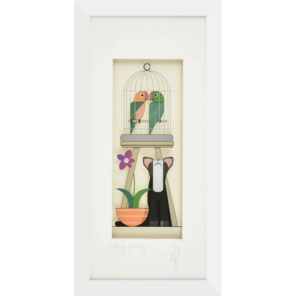 This beautiful wall art piece features a little black & white cat looking up at some colourful parkeets, as a little field mouse cowers in the grass, and is mounted in a simple white frame with a matt that has been signed and titled by the artist. It is painted on acrylic glass which is then floated in a frame to add a soft shadow that adds depth to the piece. Black Hen Designs is run by a husband and wife team based in Lisacul, Co. Rosscommon in Ireland. They have a passion for nature and rural life which inspires their pieces and the unique stories behind each of them.